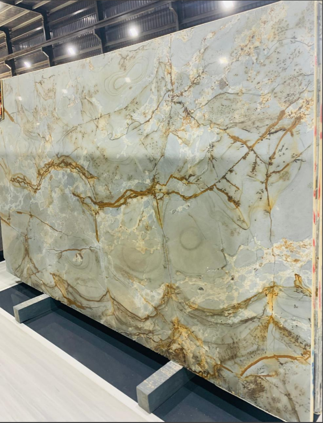 It is a natural stone from Brazil with a yellow background and occasional green streaks, valued for its beauty and durability. It is extremely hard, heat--resistant, and suitable for a variety of applications, both indoors and outdoors, such as countertops, walls, and flooring.