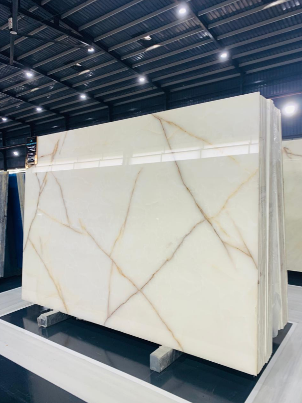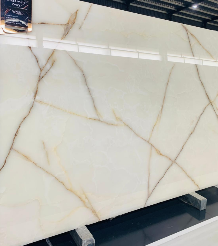It is a striking natural stone known for its intricate, web-like veining and translucency. It features a base colour that can range from warm golden tones to creamy whites and reds, with dark, bold veining that creates a dramatic, captivating effect.