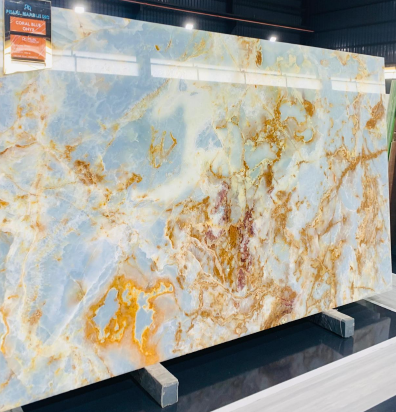 Blue Onyx Marble is a rare, translucent natural stone known for its deep blue hues and intricate veining, prized for its luxurious, elegant appearance and suitability for high-end interior design projects.